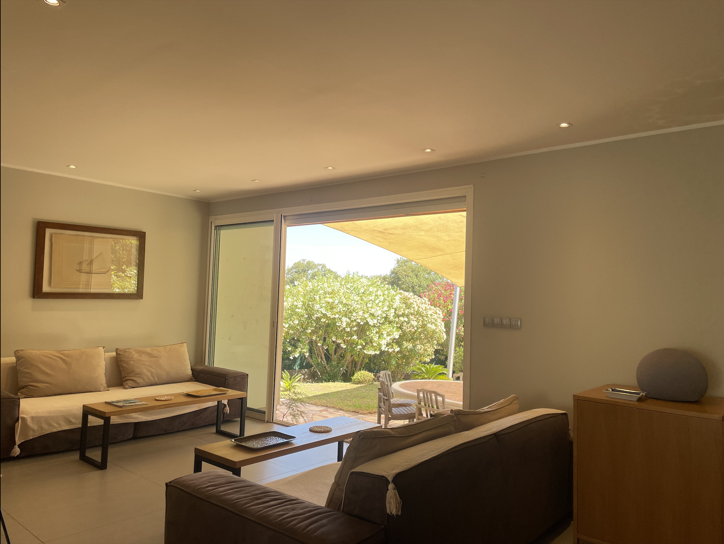 The very cozy living room also overlooks the garden on the south side. On this side, there is another large terrace with a table that can also accommodate 12 guests. An outdoor lounge with armchairs will allow for peaceful relaxation.