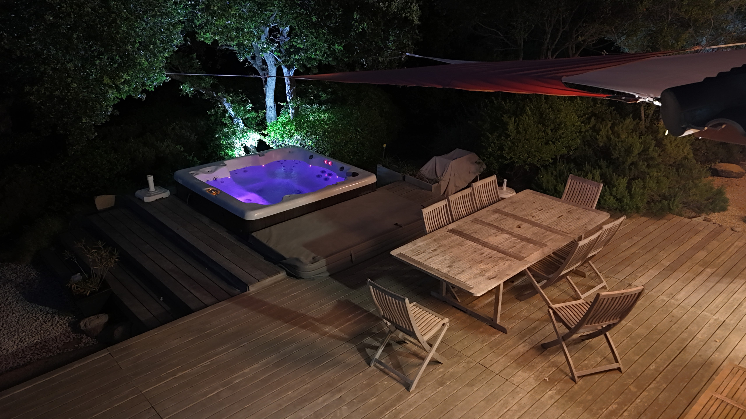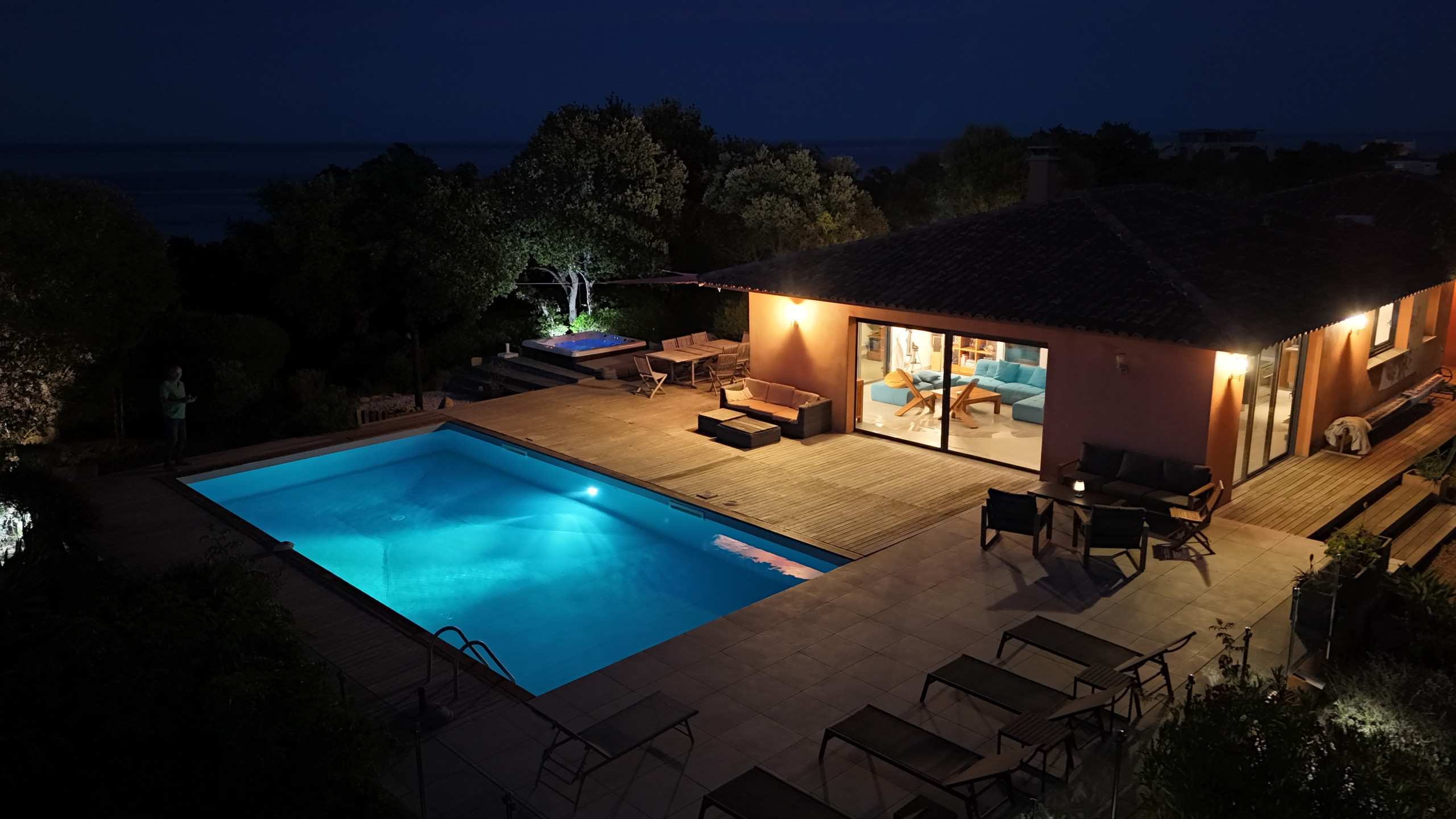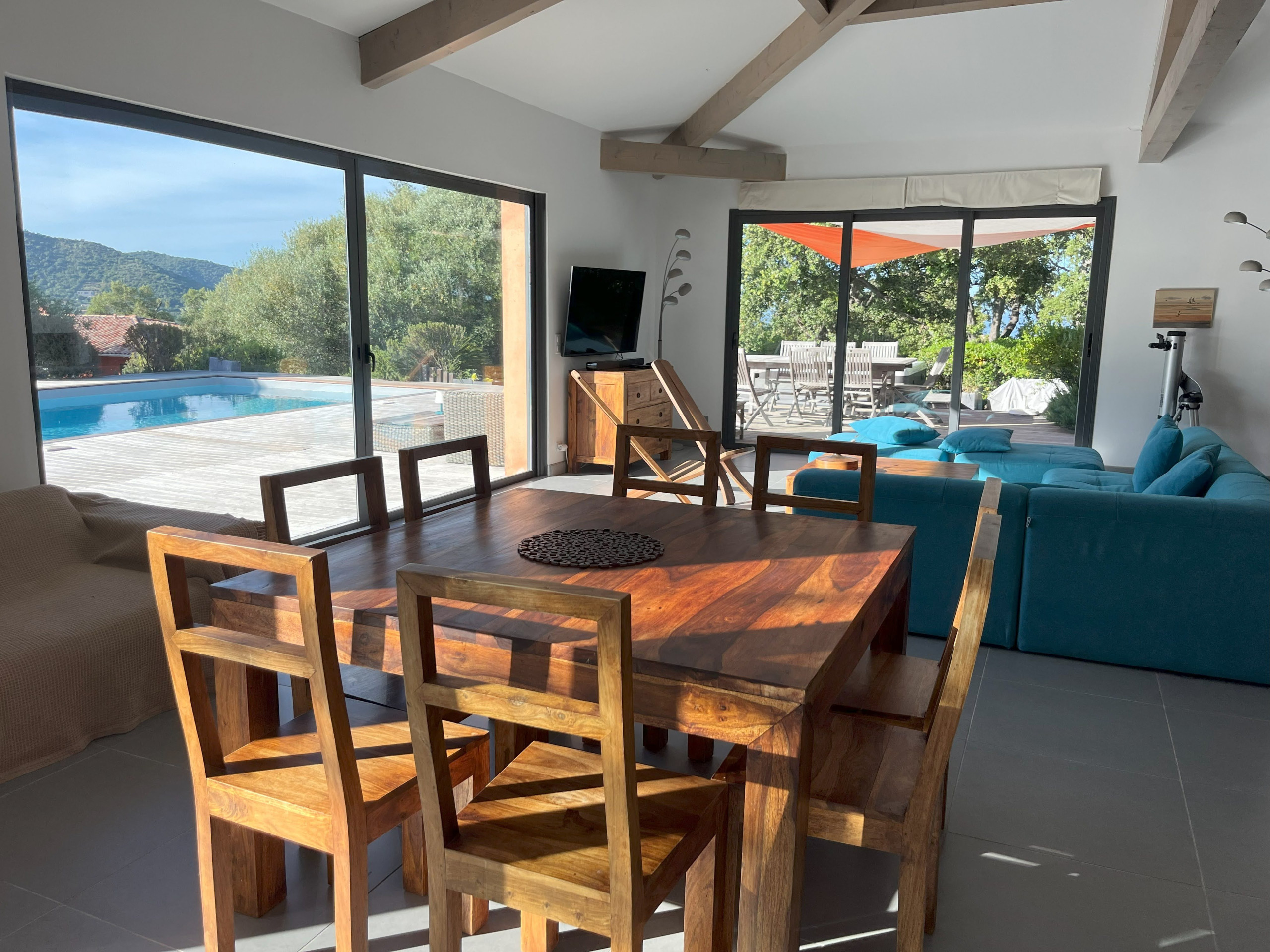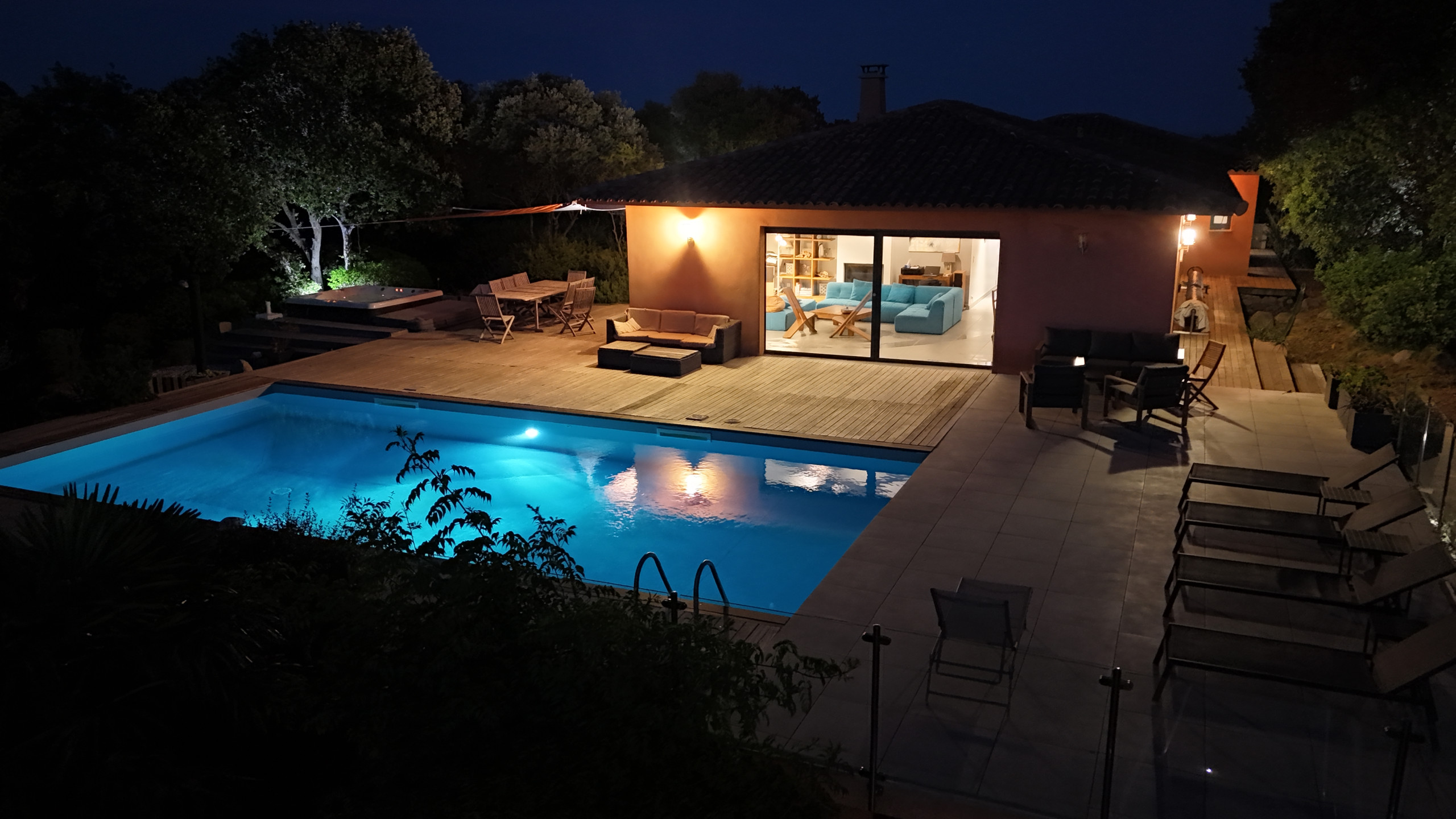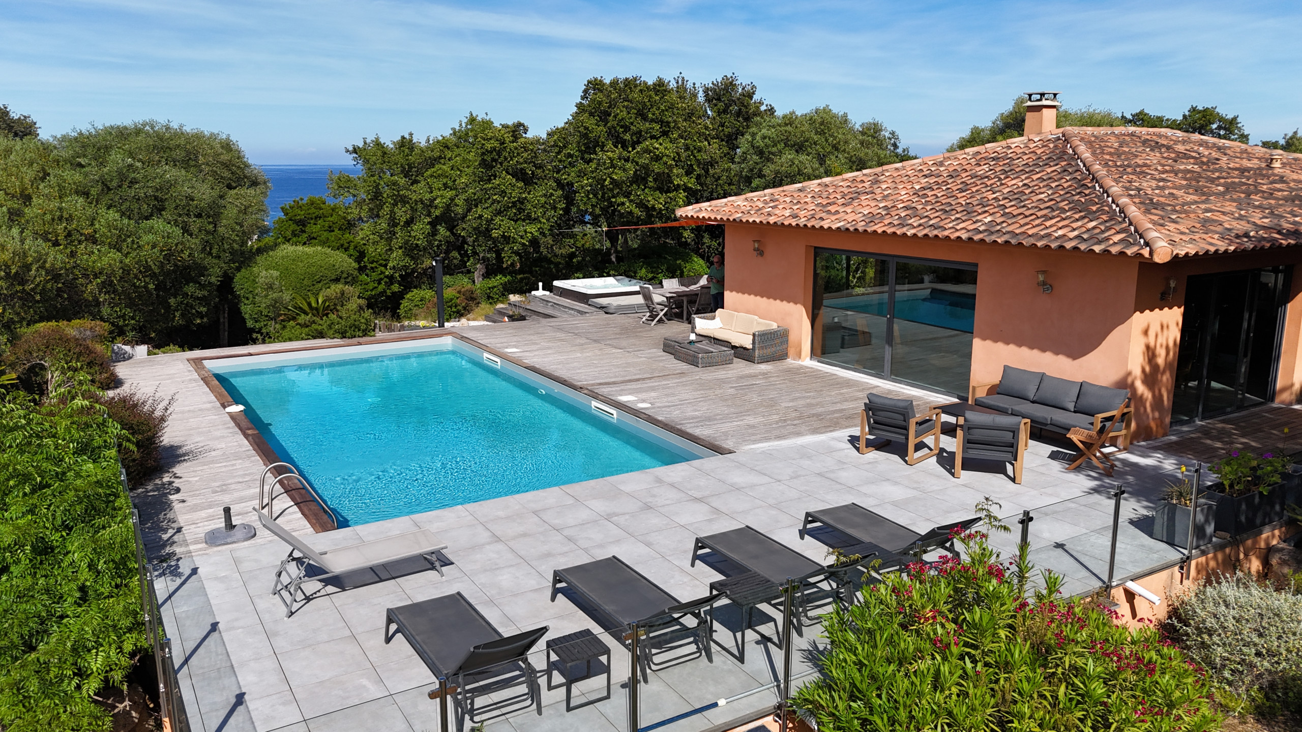 Luxury villa of 200 m², with sea & mountain view, can accommodate 12 people (more on request). The villa is on a wooded plot of 2500 m². It is surrounded by a wooden terrace with a 5 x 11 heated pool and a 6-seater SPA.
