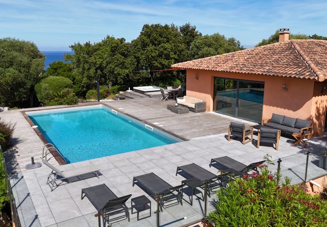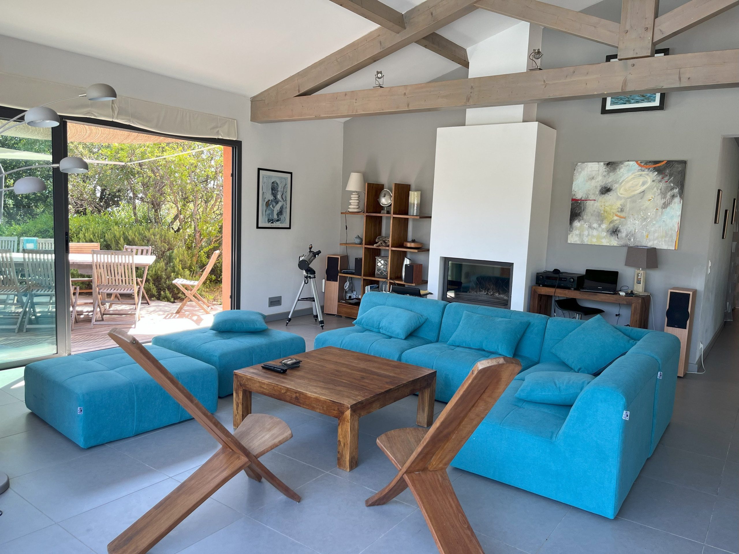 Comfortable villa, 200 m2 full feet with a wooden terrace of 200 m2 integrating a private pool (heated) 11 x 5 meters, a SPA for 6 people. Sea and mountain view on a plot of 400 meters from the beach.