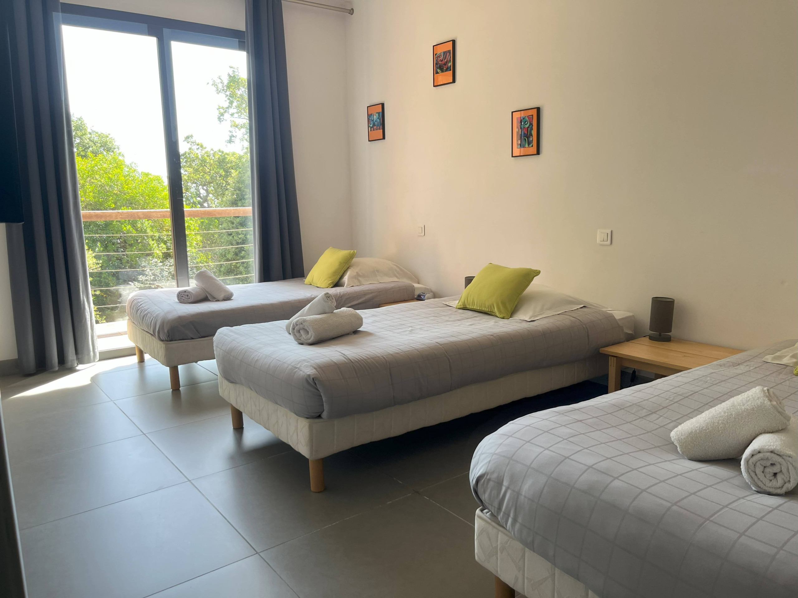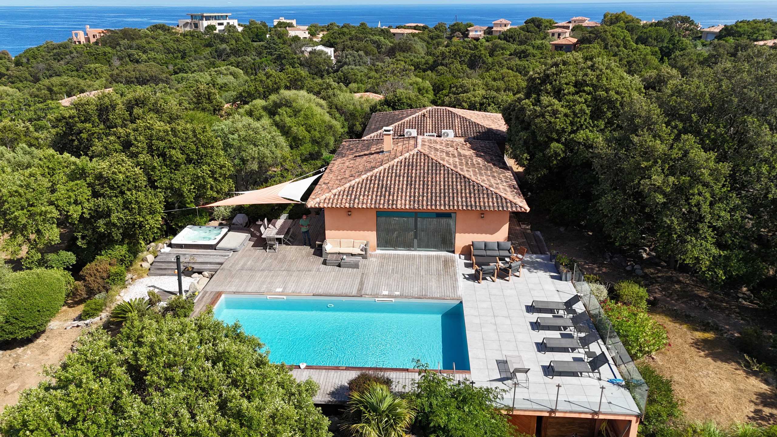 5 bedrooms including 3 with double beds, 4 bathrooms. All rooms are (website hidden) in the living room and in 4 bedrooms. Large wooden terrace of 200 m² with a swimming pool of 5 x 11 meters. Since this year, at your disposal 1 SPA 6 seats of 2.2 x 2.2 meters. View of the sea (olmuccio beach) and the mountain (fabulous sunset on the needles of bavella)