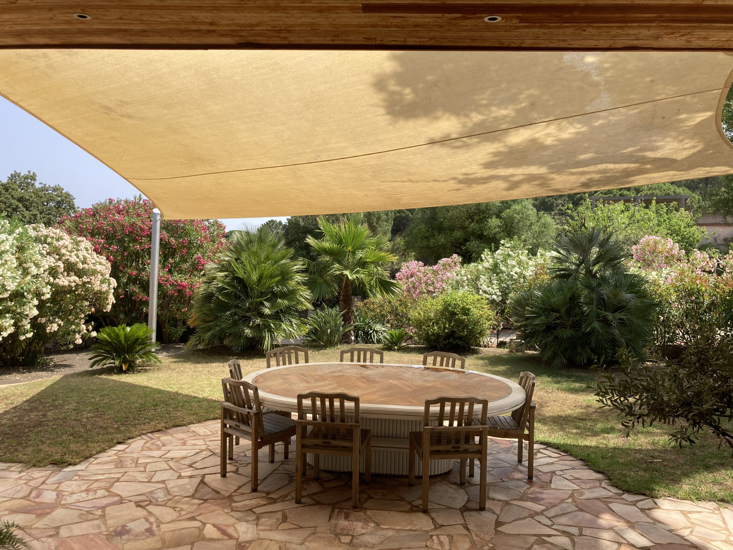 Le salon très cosy donne également sur le jardin côté sud. De ce côté il y a une autre grande terrasse avec une table qui peux également accueillir 12 convives. Un salon extérieur avec fauteuils permettra de se détendre paisiblement.