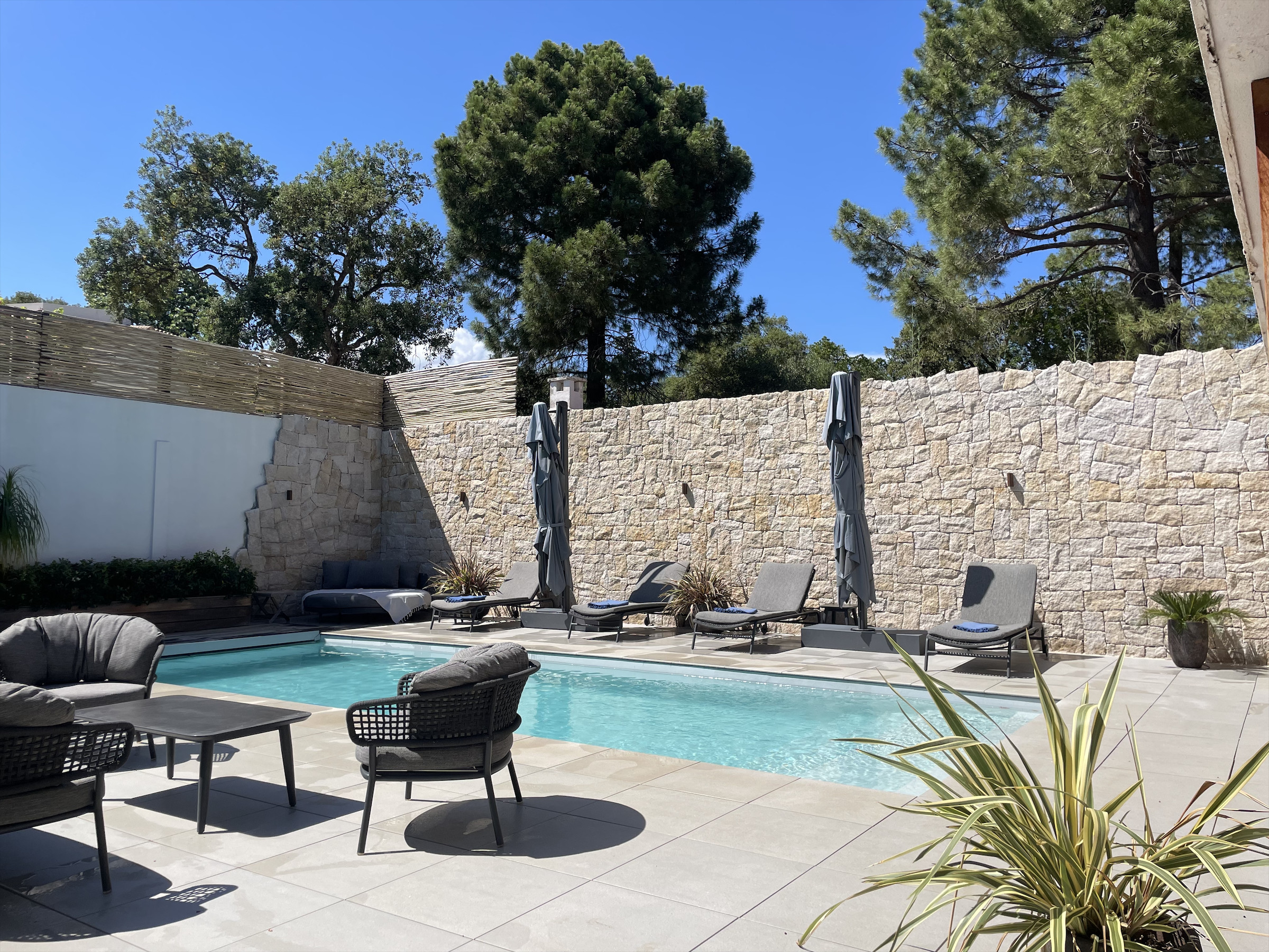 Le patio situé au centre de la villa est le lien reliant tous les espaces à vivre. Il crée une ambiance chaleureuse avec 1 table en teck pouvant accueillir 12 personnes qui est astucieusement ombragée par une pergola en IPE, garantira des repas conviviaux. Un barbecue à gaz agrémentera vos repas en famille ou entre amis. La piscine (chauffée) est également moderne et agréable avec plusieurs canapés et transats confortables situés tout autour.