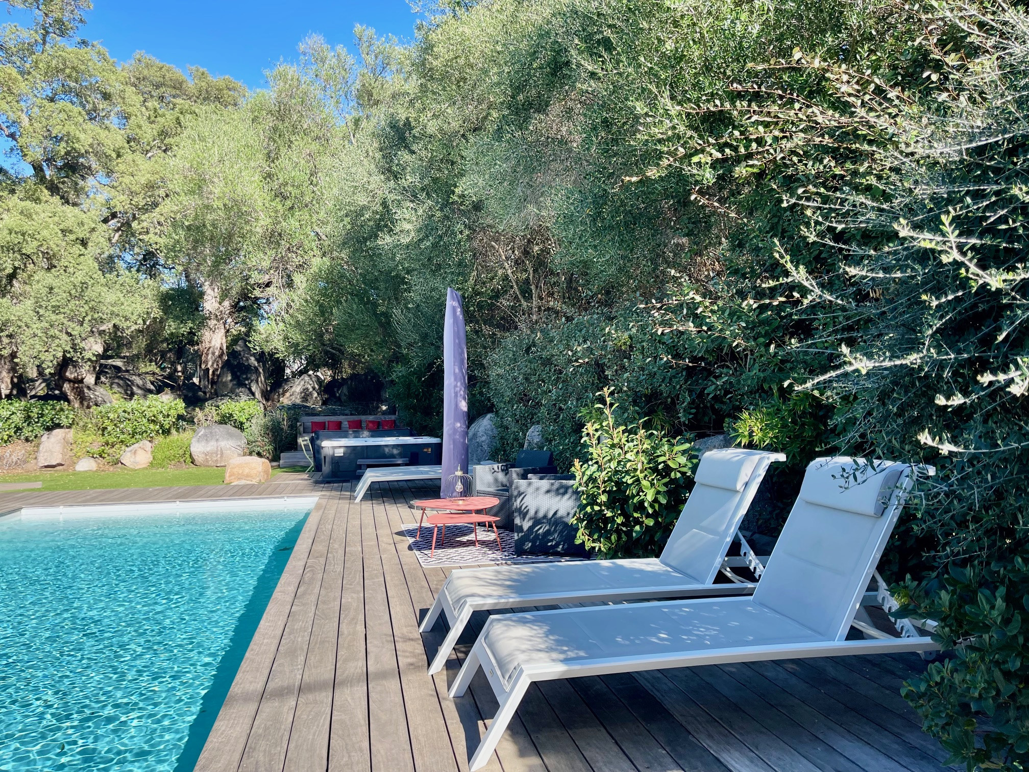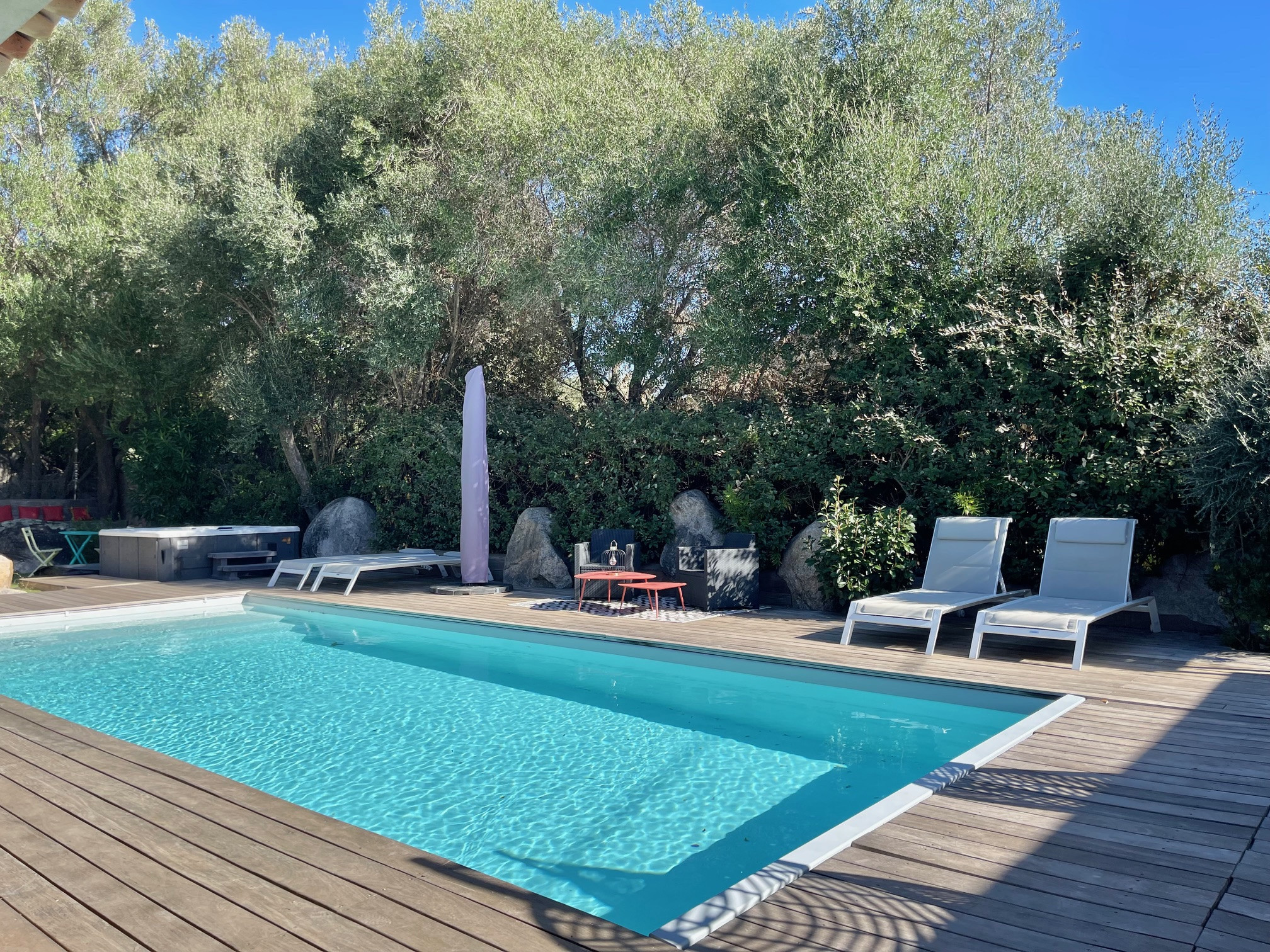 La piscine chauffée est bordée de transats et autres divers espaces, salon ainsi que d’un jacuzzi six places.