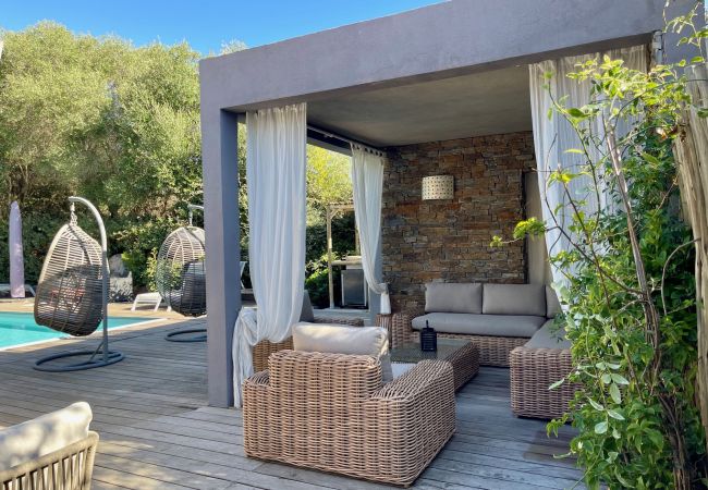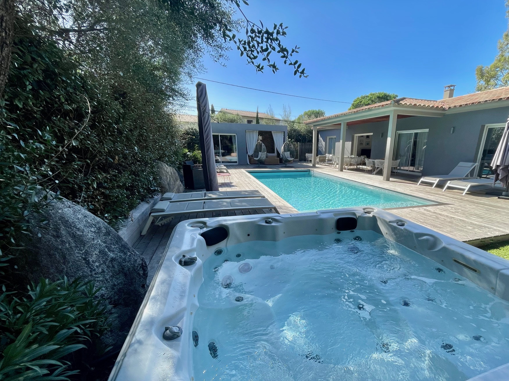 Villa très bien équipée, entièrement rénovée et climatisée. Terrasse de 350 m2 vue mer, plancha, fontaine à eau réfrigérée, spa avec massage du dos, table de ping-pong, baby-foot, paddle et canoë-kayak, 3 cours de tennis privé dans la résidence.
